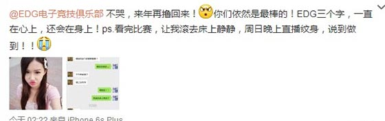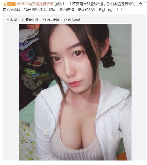 在S5八强赛EDG对战FNC还未开始之前,某游戏女主播发微博表示:“今晚无论输赢,我要把你们纹在胸前,现场直播,陪你们战斗,Fighting!!!”该消息迅速引来众多网友围观。