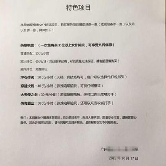 而且这些女仆装美女的陪玩服务,居然是明码标价的!网吧内粘贴了女仆陪玩服务的具体报价表,针对不同游戏、具体内容进行了在相关规定,热门游戏基本上都进行了标价,并且提供赠饮、合影、打折等优惠。