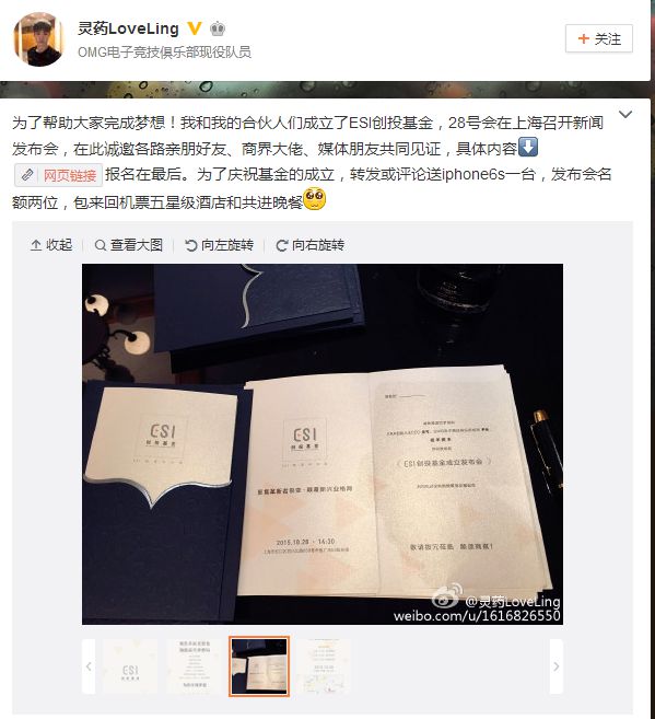 从公开的资料看,灵药和其女友将担任基金会的创始人。基金的主要投资范围包括:IT,TMT,泛文化,泛娱乐,VR,游戏。截止今日中午,该微博已经获得了1万3千多转发。诸多圈内人纷纷表示了祝贺和期待。值得一提的是,灵药的原OMG队友Uzi、gogoing等人并未转播这条微博。按理说,作为队友,对灵药这么大的动作应该第一时间站台表示支持才对。如今OMG老队友们纷纷沉默,其中缘由耐人寻味。