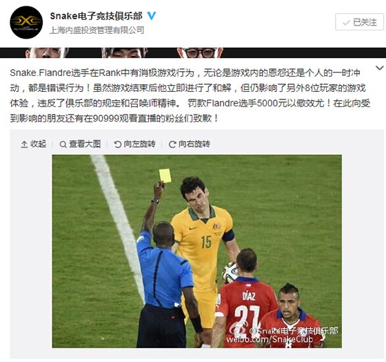 Snake.Flandre选手在Rank中有消极游戏行为,无论是游戏内的恩怨还是个人的一时冲动,都是错误行为!虽然游戏结束后他立即进行了和解,但仍影响了另外8位玩家的游戏体验,违反了俱乐部的规定和召唤师精神。 罚款Flandre选手5000元以儆效尤!在此向受到影响的朋友还有在90999观看直播的粉丝们致歉!
