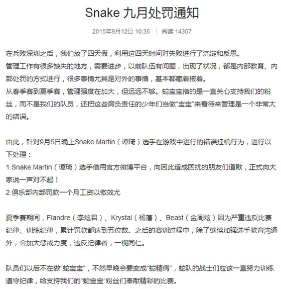 在今年9月份LOL四周年兵败深圳之后,Snake俱乐部曾经就队内队员的消极态度以及违反俱乐部训练规定等问题进行过公开处罚。近日,Snake俱乐部再次对上单圣枪哥开出罚单,原因是圣枪哥在最近的直播排位中出现了挂机的现象,这次的处罚力度为5000元人民币。