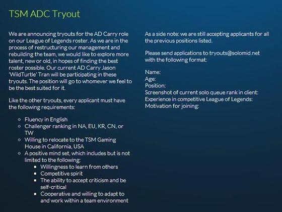 而就在26日晚,TSM宣布他们连射手的位置都需要新鲜的血液,他们正式对外宣布招收新的ADC,同时野龟哥WildTurtle将会与新AD竞争出场机会。此时TSM的原首发仅剩下比尔森Bjergsen一人。