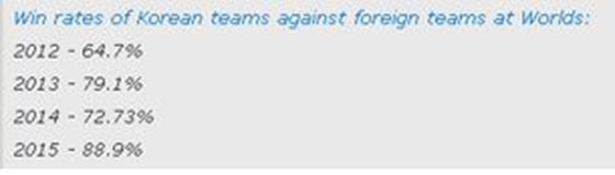 FNC惨遭淘汰,S5决赛提前上演为LCK秋季赛决赛,对于韩国赛区一家独大的局面,国外网友对此表示甚为担忧,一方面担心LOL再次成为韩国人统治的星际2,这将打击削弱其他赛区的动力与粉丝兴趣;而另一方面则有人大度表示,韩国人顺应历史,自身的强大促进了联盟的发展,应视为积极因素,而非妖魔化为电竞毒瘤。