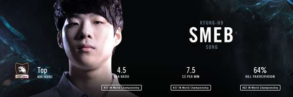 小组赛的KOO分组就不太起眼,线上也不太起眼,更多的观众只知道,他们是个强队,却对KOO的选手印象很少。八强赛中Smeb终于翻身了,在对阵老对手KT的超级上单Ssumday时,他的剑姬打爆了对面,这才让观众们惊叹:原来这个叫Smeb的上单这么强。