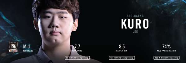 小组赛的Kuro表现的并不够好,在面对FW的中单Maple甚至一度被压的不能自理,不过在整个小组赛的沉寂后,他终于在八强赛中爆发了。在对阵KT的赛点局,Kuro拿出了他的神勇状态,维克托的爆炸输出把KT阻止在四强的门外,也让KOO离他们的梦想更近了一步。