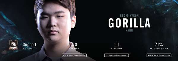 GorillA是一名人缘挺好的选手,长得和和气气的他却在赛场上有着不一般的侵略性,曾经和NJWS一起进入S4总决赛的他有着相当精湛的操作和节奏带动能力。这名选手在S5上每场的表现都很不一般,不管是对线还是开团,似乎总能稳稳的套路住对手。