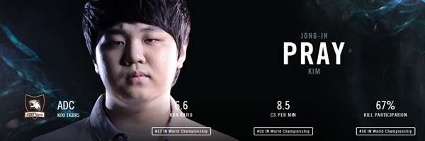 大家对Pray一定陌生又熟悉,这名选手从S2时期开始就凭借着一手老鼠的出神入化称霸当时的OGN,更是得名“鼠王”。鼠王在S3赛季可谓在ADC位置上呼风唤雨,但在S4赛季的状态欠佳,就被迫被老东家NJBS宣布离队,经过了一段时间的沉寂,他来到了KOO。S5上的鼠王表现一如既往的稳定,作为队中的C位,鼠王可谓是把经验和操作结合到了极致,你很少能看到他在线上被压制的情况,而且他仍旧保持着凶悍的打法,只不过如今更加稳健。
