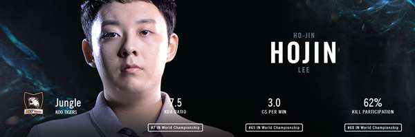 这名选手以前的ID叫Lee,是他的姓,后来又把ID改成了Hojin,他的名。和他之前的ID一样,他是一个很强力的盲僧使用者,也是一个前期节奏的带动者。IEM后这名选手的状态下滑严重,曾经一度去看饮水机,经过了一段时间的努力又重回的首发位置,这让很多人一度认为打野就是KOO的突破点。但S5上的Hojin证明了这种想法的错误,他的表现称不上多么出彩,但足够目的明确,也足够让KOO在十二支队伍脱颖而出。
