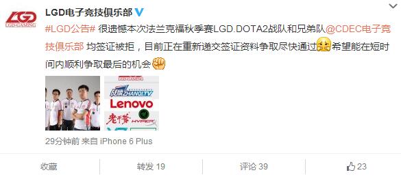 今日晚间时分,LGD官方微博发布消息,称LGD与CDEC两队赴法兰克福参加秋季赛的签证全部被拒。目前正在重新递交签证资料争取尽快通过,希望能在短时间内顺利争取最后的机会。