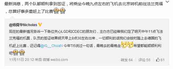 北京时间早上8点48分,LGD经理超人蛙终于更新了昨天等待最后签证结果的微博。粉丝们悬在嗓子眼的心终于可以放下了,因为他说:“最新消息,两个队都顺利拿到签证,将乘坐今晚九点左右的飞机去北京转机前往法兰克福,总算好事多磨赶上了比赛。”