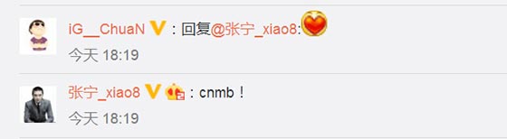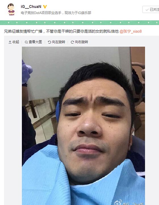 今日ChuaN在法兰克福秋季赛正赛前一天的休息期间,闲来无事在微博为小8发布了一则“征婚启事”,称“兄弟征婚友情帮忙广播,不管你是干嘛的只要你是活的女的就私信他 @张宁_xiao8”。