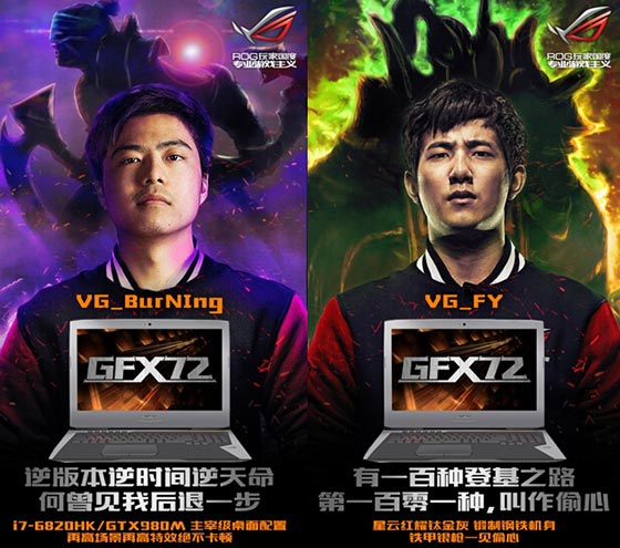 在本次DOTA2秋季锦标赛上,ROG GFX72成为了官方指定用机。配置17.3英寸的全高清IPS屏,广阔视野随你掌;30键无冲突的背光键盘,舒适键程设计,操作得心应手;华硕超频大师级的酷冷散热系统,双风道动态除尘技术,通宵鏖战告别发热干扰;i7-6820HK可超频处理器搭配发烧级独显GTX980M,正如VG _BurNing一样无论面对何种困境,都将一往无前;ROG超越级外观设计,钢铁侠式设计理念融入GFX72,如果你见过VG _FY拉比克的世纪之偷,你就会明白什么叫一见偷心。