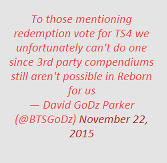 Godz在他的推特中提到,本届TS4将不会设有救赎投票功能——即第三方投票复活参赛队伍。推文中提到的救赎投票的预留了队伍的位置,但是这8支参赛队伍(一支直接受邀、一支救赎投票选出、另外6支地区赛产生)中,还有1支队伍未曾公布。