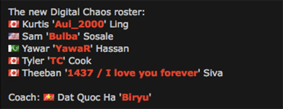在前不久结束的秋锦赛上,C9成功夺得了一个正赛的席位。然而在输给A队后最终只取得了13-16名的最差战绩。赛事结束后,C9官方宣称其队员ritsu“不具备作为职业选手的素质”并将其离队。值此风雨交加之际,C9队长1437选择离队出走并加入原本五人齐的DC,使得由TI5冠军队员2000哥坐阵的DC战队也是做出了人员调整:原主力队员“Biryu”转为担任教练一职。2000哥表示对1437的到来“及其兴奋,并对未来满怀期望”。