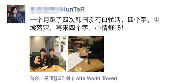 北京时间12月1日下午,VG经理Hunter在朋友圈更新消息,称“一个月跑了四次韩国没有白忙活,四个字:尘埃落定,再来四个字:心情舒畅!”