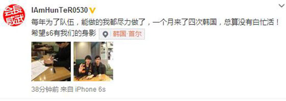 很快,Hunter在微博也正式公布了这一消息。他说道“每年为了队伍,能做的我都尽力做了,一个月来了四次韩国,总算没有白忙活!希望S6有我们的身影。”