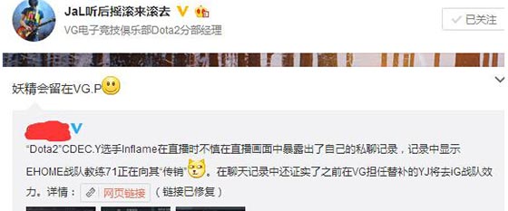 不过随后,VG DOTA2分部经理在微博上对此事予以否认,明确表示“妖精会留在VG.P”。
