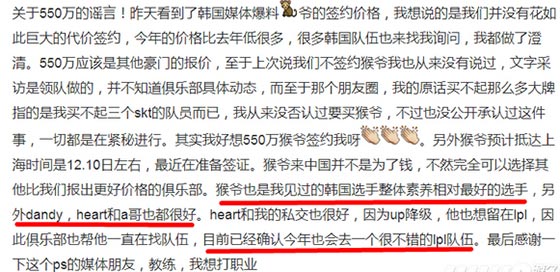 文中还提到,因为UP的降级,原辅助Heart将要去到一个不错的LPL队伍。Heart本是三星蓝的辅助,在2015年来到UP战队,成功的在夏季赛带领UP战队从LSPL冲入了LPL,但是UP实力不足导致的再次降级,让这名韩援只能另寻高就。如今LPL中缺少辅助的队伍不在多数,其中强队更是少之又少。