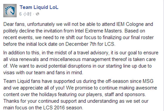 IEM科隆站将于12月18-21日打响,在北美区的投票中,C9和TL占据前两名,将代表北美参加比赛。但今天TL官方脸书发文称将要放弃IEM科隆站的比赛。
