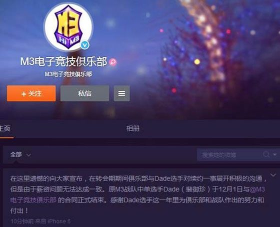 今日M3电子竞技俱乐部在官方微博宣布,俱乐部与中单选手Dade在薪资问题上无法达成一致,因此与Dade的合约正式结束,感谢Dade一年的付出及努力: