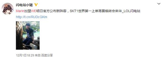 在12月1日,圈内一家小道媒体“闪电站”放出Marin即将加盟WE的消息,并称WE官方将在第二天正式对外公布。尽管圈内人都知道这家闪电站向来以遵照听风就是雨的原则各种编造引人眼球的所谓“爆炸新闻”,其真实度几乎为零,但还是有不少人好奇的进行了转发。