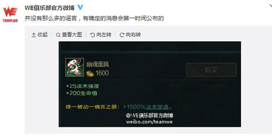 而官博配图放上了一张LOL游戏内道具“幽魂面具”的截图。幽魂面具意味着什么?兰博的必出装备之一!而Marin在S5总决赛上的表现你们都看到了!