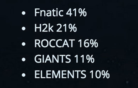 关于欧洲战队的结果,Fnatic战队以41%的得票率获得第一,而第二的H2k得票率仅约为Fnatic的一半,只有21%。但由于Reignover、Huni和Yellowstar等三名队员出走,Fnatic战队很有可能会再次弃赛,那么将会由第三的ROCCAT战队获得参赛资格。