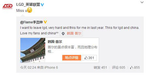 因合同到期,李浩钟Flame选手目前已经返回韩国。在此,我们非常感谢你一年以来对于LGD英雄联盟成长和荣誉所贡献出的一切努力和汗水,也会记得你给我们带来的所有美好回忆。祝福大公主能在韩国找到适合自己的队伍,继续征战职业赛场,有缘的话我们S6见。