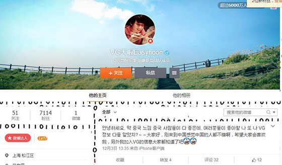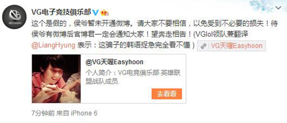 今天VG俱乐部官方正式通告,微博上名为“VG天喔Easyhoon”的账号并不是Easyhoon本人,他还没有开通微博,希望大家不要上当受骗。