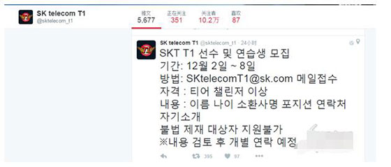 此条推特的大致内容是SKT正在招聘新选手,如果有意向的选手可以在12月2日-8日期间发邮件给SKT战队。招聘的选手需要至少达到挑战者等级(也就是国服王者以上等级),而有意向的选手可以发邮件给SKT官方邮箱并且注明自己的姓名、年龄、籍贯以及账号截图相关内容。