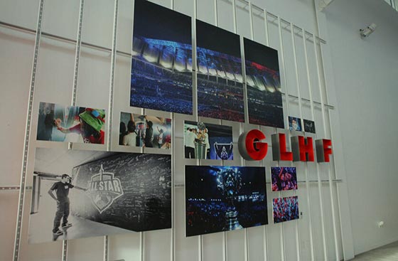 在尚未正式进入屋内,有一面涂鸦墙深深的吸引了大家的目光,原来是某位艺术家有次来总部演讲、教学时所绘制。他原将英雄与Riot员工结合画在帆布上 ,但因为太有意义了,后来就将它印刷成现在这个样子摆在门口供更多人欣赏。