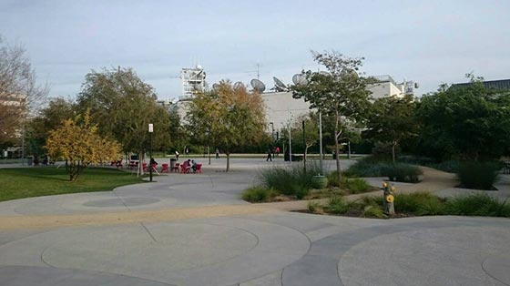办公室外围有一片开放式区块,沿着小路走会发现一些熟悉的巧合,一问之下才知道,若是用鸟瞰的方式,脚下踩的其实是一座召唤师峡谷!