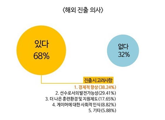 考虑前往国外发展的68%选手中大部分是20岁到25岁之间的年轻队员,他们出国的首要原因基本是收入问题,也有29.41%的选手是为了自己的发展前景、17.56%的选手考虑到更好的环境设施制度。韩国电竞的制度比较严格,早些时候还禁止直播,离开韩国能够摆脱电竞协会的约束,很多其它赛区的俱乐部对韩援没有很严格的要求。而像前世界冠军的三星队员Heart、Acron退役后都能在俱乐部完成教练等角色转变,这也是职业选手的出路之一。电竞选手的职业生涯比较短暂,这让他们对未来感到不安,有不少韩国家庭遭受债务,队员们在退役和经济压力下,他们渴求25岁之前尽可能的创造更多的价值,这是进军海外的最大因素。
