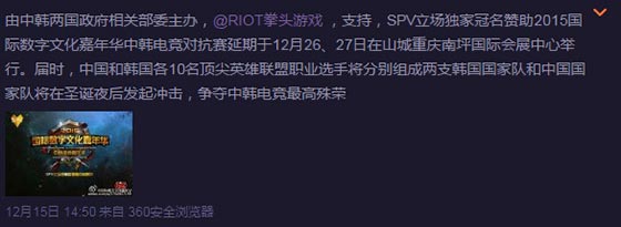 由于原定于12月10号LPL转会期延迟到12月24日,新赛事LPL将于1月14日进行,各俱乐部存在阵容无法确定,磨合以及备战新赛季等诸多问题,无法达到20人组成的中韩国家队参赛阵容。经国际数字文化嘉年华组委会一致讨论决定,为保证活动质量,比赛延期举行,再次大家带来的不便,深感抱歉,所购买门票全部退票。