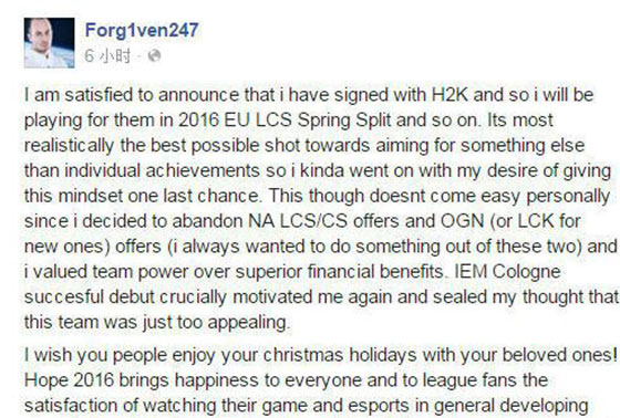 “我非常满意地宣布:我已经跟H2K签约并随队征战2015欧洲LCS春季赛...这次的决定并不简单,圣诞节我因为我拒绝了北美LCS及其二级联赛,韩国OGN的战队邀请。我更看重队伍的实力而不是金钱。IEM科隆站的表现让我觉得这支队伍有足够的硬实力。”