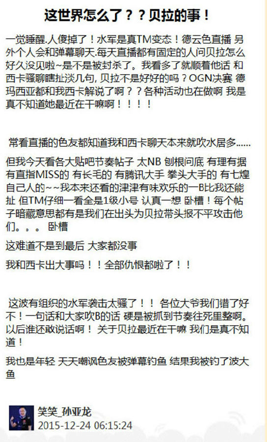 当时围观群众就炸啦!不少人都在猜测这个人的身份,有人说是长毛,有人说是MISS,有人说是台湾的新晋女解说,但是也有人觉得解说不会有这么大的权利,贝拉得罪的可能是高层领导,总之呢,就是各种猜测满天飞,一个不小心“贝拉怎么了”就成了贴吧搜索热门!