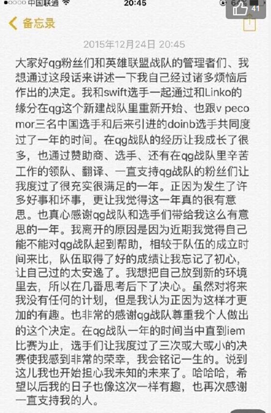 12月24日在国内LOL圈,QG无疑是被大家谈论到最多的战队。他们先是对外宣布被NB收购,随后官方又确认了UZI小狗的加盟。QG俱乐部的“大地震”甚至抢走了不少Marin来华的关注度。然而这并没有结束,在24日晚间,QG教练Hiro在微博发表长文,正式宣布了离队消息。