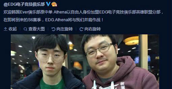 欢迎韩国Ever俱乐部原中单Athena以自由人身份加盟EDG电子竞技俱乐部英雄联盟分部,在即将到来的S6赛季,EDG.Athena将与我们并肩作战!