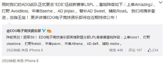 此外隶属于EDG旗下的ADG战队正式更名“EDE”征战新赛季LSPL ,基础阵容如下:上单AmazingJ 、打野 Avoidless、中单Baeme 、AD jinjiao 、替补AD Sweet、辅助Road。