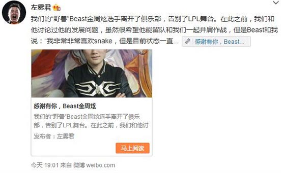 我们的“野兽”Beast金周炫选手离开了俱乐部,告别了LPL舞台。