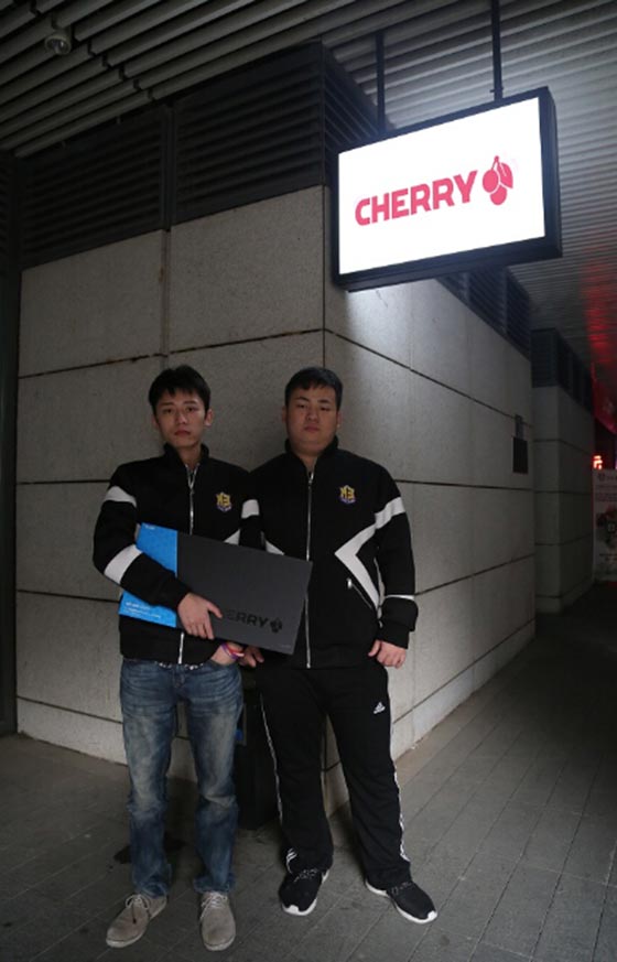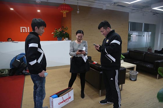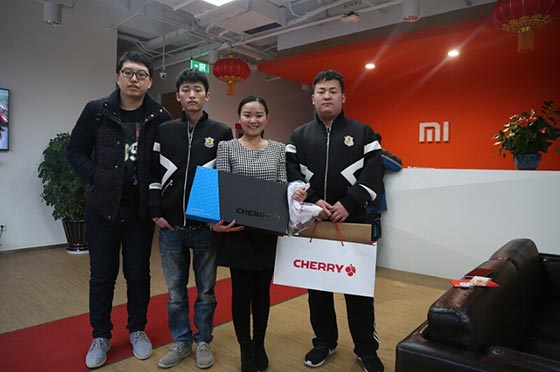 果然这一次有幸体验到明星队员送货的粉丝是一位妹子,队员们将CHERRY键盘送到他手中,同时还一同附赠了CHERRY特地准备的T恤、2016年年历和CHERRY Logo二色键帽。妹子见到心心念念的偶像们激动不已,表示“真人比屏幕里看起来更帅!”。随后大家拍照合影,愉快了结束了此次互动之旅。