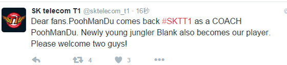 今日SKT官推:亲爱的粉丝们,PoohManDu以教练的身份回归SKT啦!小将Blank也将于近日以打野的身份加入我们,请欢迎他们吧!