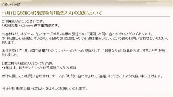 常年混迹游戏圈的诸位玩家,或多或少都会知道几个运营商纪念玩家的方式,尤其是暴雪,暴雪很喜欢将有故事的玩家加入他们的游戏中,无论是被称为英雄的少年宏宇,还是火车王LEEROY。而近日,日本一款名为《戦国炎舞-KIZNA-》的免费手游,为了纪念一名玩家的AFK竟然特地发布了一个“全年保持战斗力第一”的称号来纪念这名名为ichi的玩家,而纪念的原因十分简单,这名玩家在这款游戏里,花费了超过3亿日元(合约2千万人民币)。