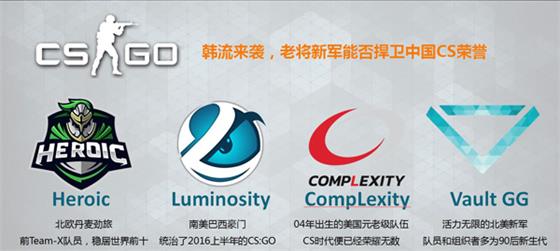 在赴华参战的四支国外战队中,最引人著名的当属“巴西大哥”——Luminosity Gaming。这支实力超凡的战队一度统治了2016年上半年所有的CS:GO比赛。而丹麦劲旅Heroic和北美豪门Col也都是不可小觑的对手。前者富含数位Team-X的队员;后者是04年就诞生的元老级战队,在CS的时代就已经荣耀无数。而最后一支Vault GG,光看名字可能对观众而言并不是特别熟悉。这支来自北美的青年军建队4个月就拿下CEVO Season 8北美第二名的优秀成绩,可谓是北美CS:GO新生代力量的代言人。