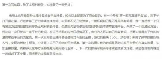 有一个号称“第一游戏直播平台“的,我下午打开排在第二行或者第三行的游戏主播房间,半天都不见几句弹幕,一度怀疑自己是不是网络有问题。我一直想做一个只有第三方监测数据没有掺杂主观判断的排名,但是我无法在做到客观的同时还不得罪直播平台。采取了一个变通的方法:我决定一次只发布一家平台的数据。