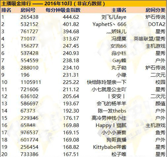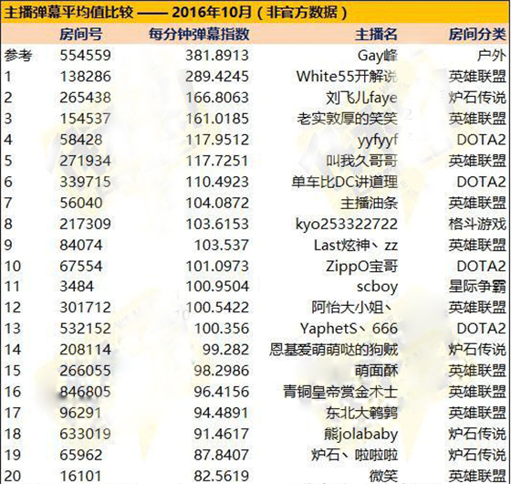 2.这个排名剔除了10月直播时长在6000分钟以下的主播,其实有非常多的主播单位时间内收入更高,但是排名还考虑了持久性的因素。有个别主播因为自己刷弹幕,造成在线时间非常夸张,单位指数和排名因此下降。