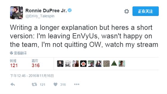 昨天Talespin本人在推特上发了一个长微博,声明他并非要退出守望先锋,虽然确实会找新队伍但目前还不着急。微博中讲述了他离队的原因,大意是因为相处的不开心,他对于游戏的认真和付出的程度得不到队友的回应。