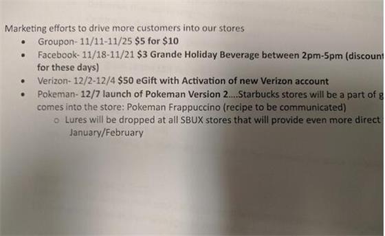 根据传闻,此信件是星巴克内部的营销活动计划备忘录,旨在与合作商以进行营销活动吸引顾客。而其中最为显眼的便是《精灵宝可梦GO》“二代精灵”的更新日期,尽管许多人对其真实性质疑,尤其是信件中将所有“Pokemon”错拼成“Pokeman”。