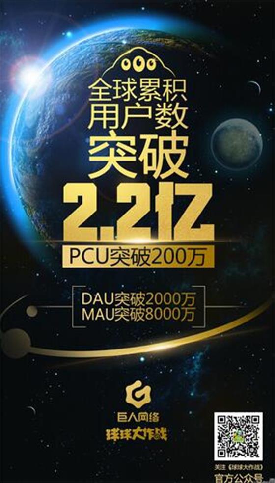 巨人网络《球球大作战》今日公布全球累积用户突破2.2亿,其中日活跃用户数(DAU)突破(2000万),月活跃用户数(MAU)突破8000万,最高同时在线玩家数(PCU)突破200万!