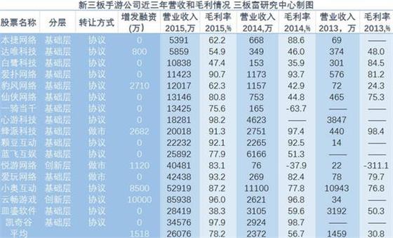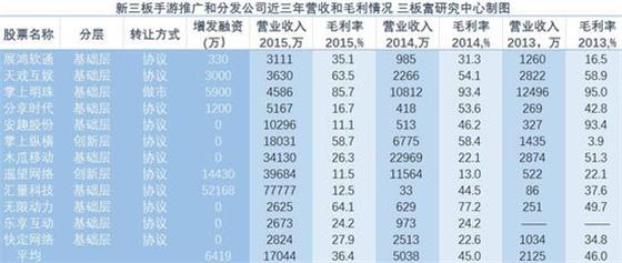 三板富研究中心筛选出主业更倾向于手游推广、分发和联运的12家公司(如下图),发现这些公司近三年营收同样增长非常迅速,从2013到2015年平均营收分别为2125万、5038万和17044万。但与手游工作室对比鲜明的是,手游分发和联运的毛利率一直稳定,平均在40%上下波动。